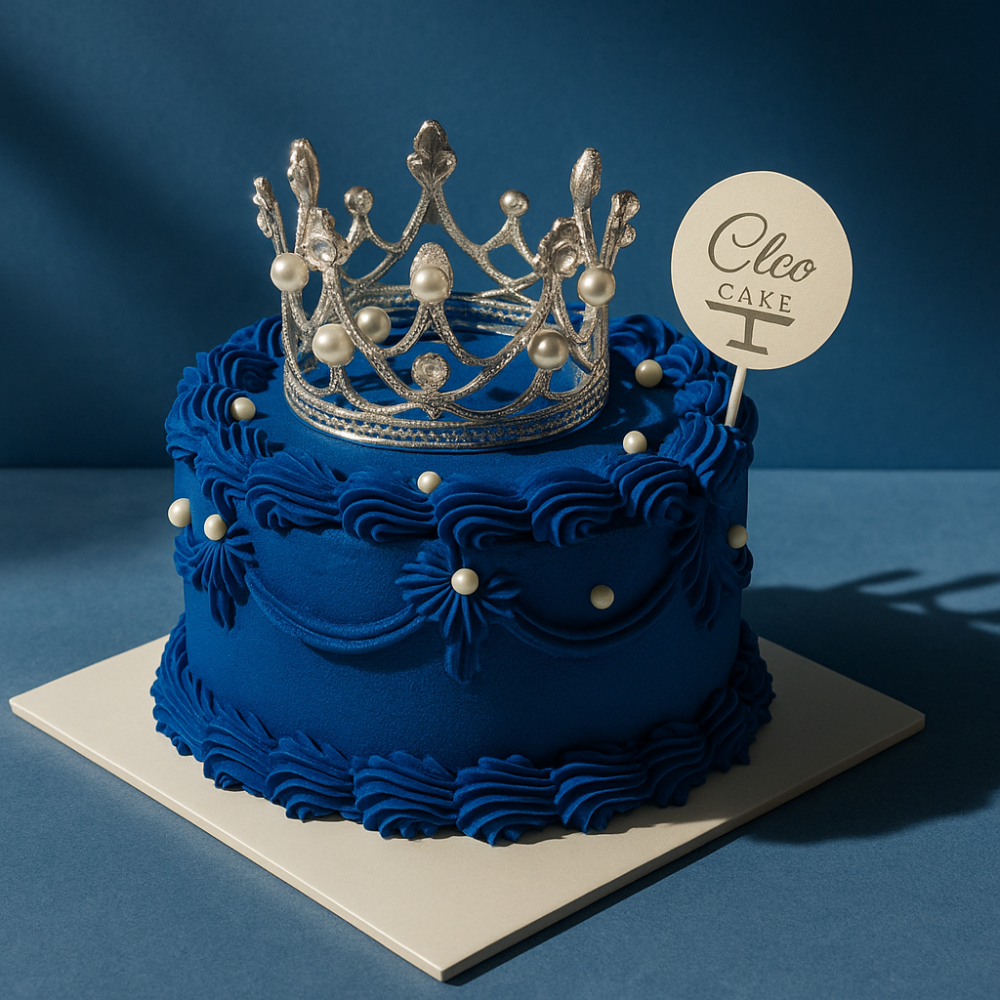 كيكة فاخرة باللون الأزرق الملكي بتصميم أنيق يزينها تاج فضي مرصّع باللؤلؤ، تعبّر عن الفخامة والذوق الرفيع 👑 💙.