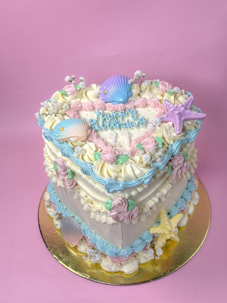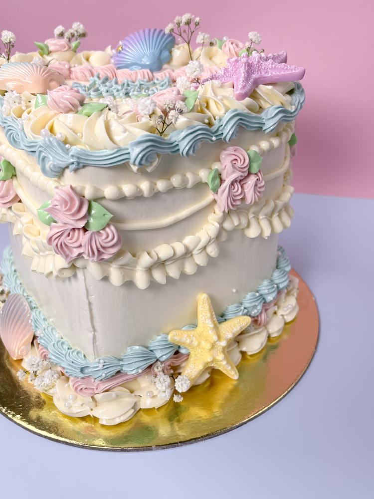 كيكة بتصميم كلاسيكي يجمع بين صدف ونجم البحر مُزينة بورد طبيعي